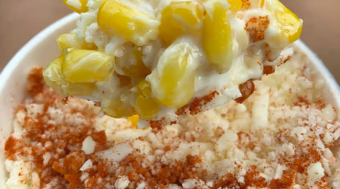 Corn in a cup with cotija cheese, chili powder, and mayonnaise.