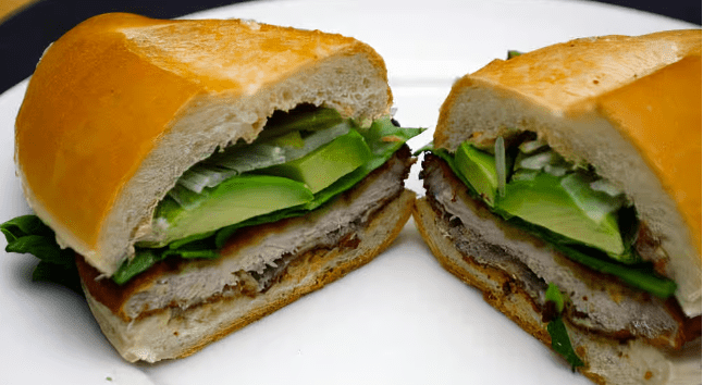 Beans, lettuce, tomato, avocado, jalapeno, mayonnaise, and cheese.